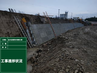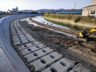 工事内容…河川工事(大型ブロック積・根固めブロック据付)